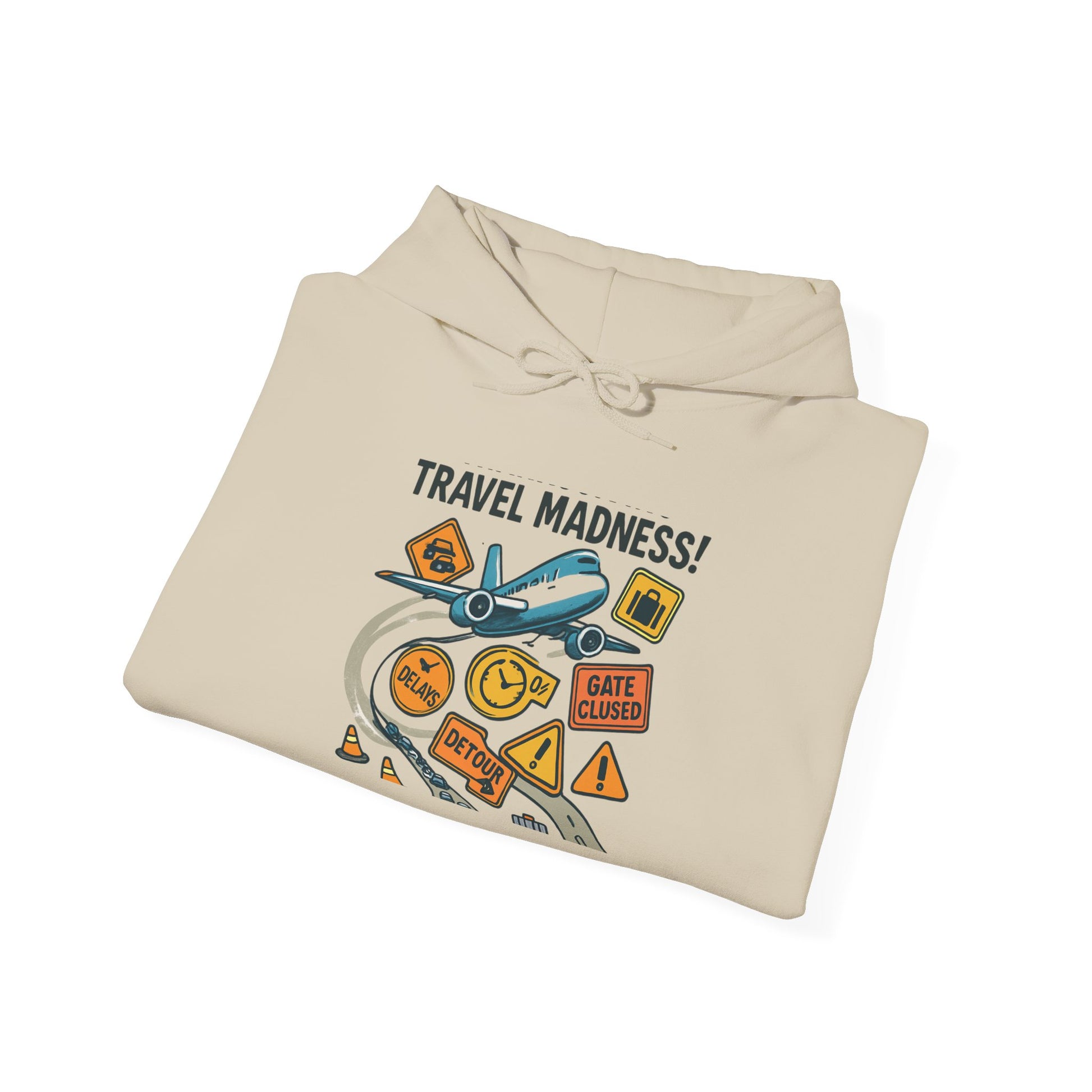 Travel Madness Hoodie — Graphic Travel Icons & Passport Stamps Sweatshirt